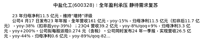 值得注意的是:2024年04月华泰证券的分析师,首次发布关于中盐化工的研究报告,标题为:中盐化工(600328):全年盈利承压 静待需求复苏。