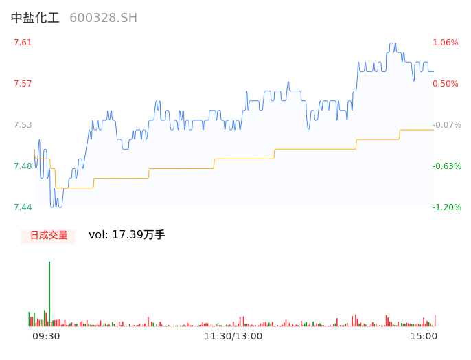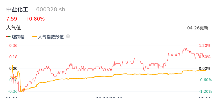 04月26日,中盐化工收报7.59,股价涨幅0.80%,成交金额1.31亿元,换手率1.20%。