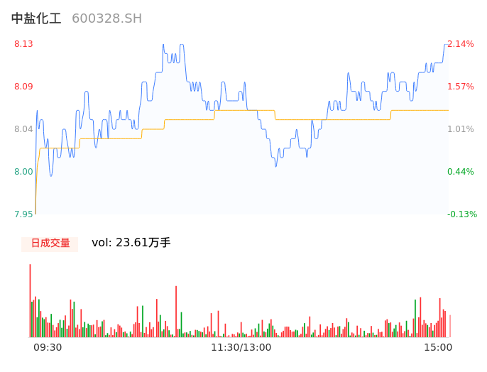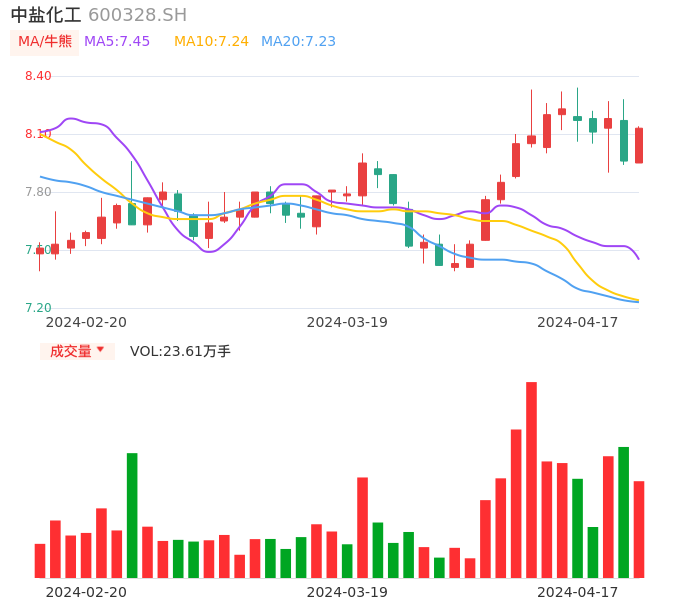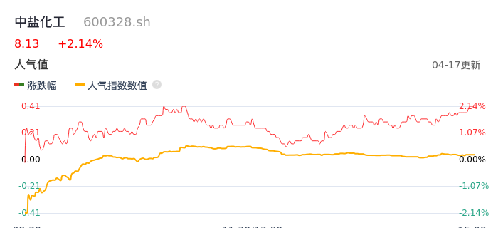 04月17日,中盐化工收报8.13,股价涨幅2.14%,成交金额1.90亿元,换手率1.62%。