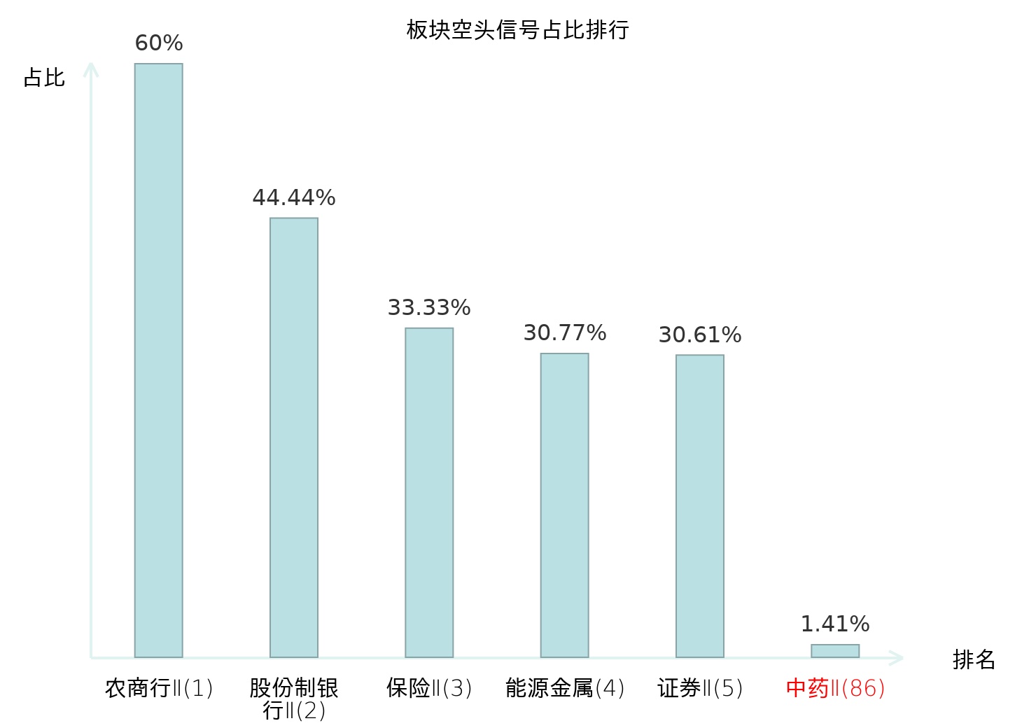 全市场所有行业板块中主力空头信号占比排名中,农商行Ⅱ板块位居第一。证券Ⅱ板块名次提升最快,较昨日上升119位。