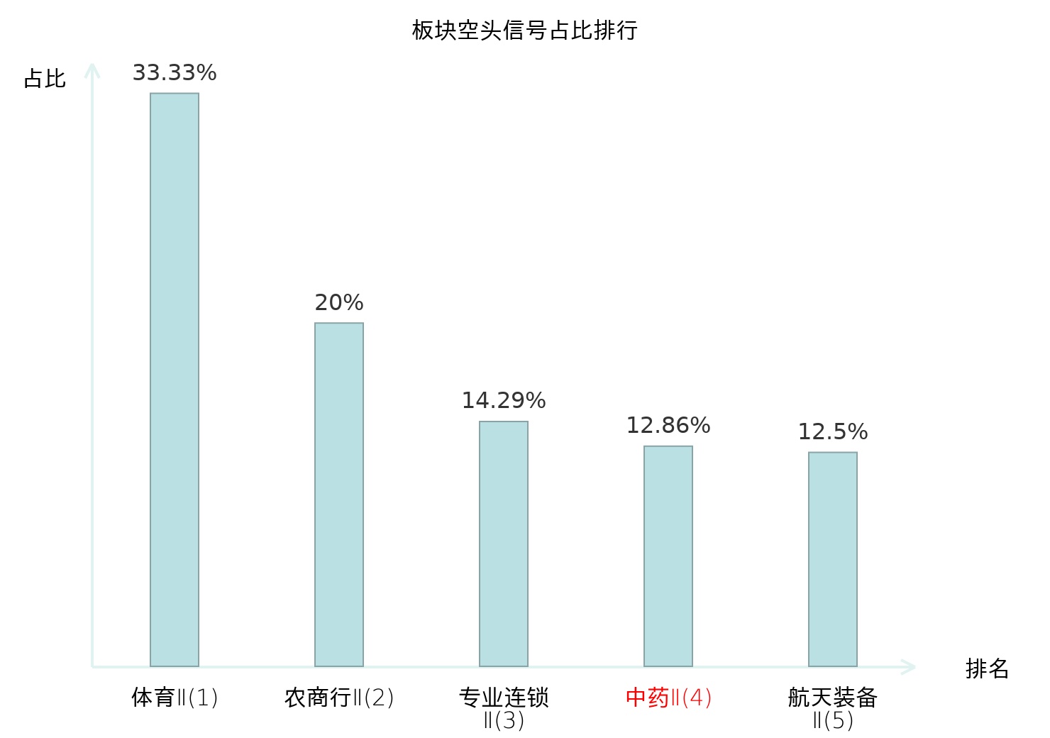 全市场所有行业板块中主力空头信号占比排名中,体育Ⅱ板块位居第一。医药商业板块名次提升最快,较昨日上升107位。