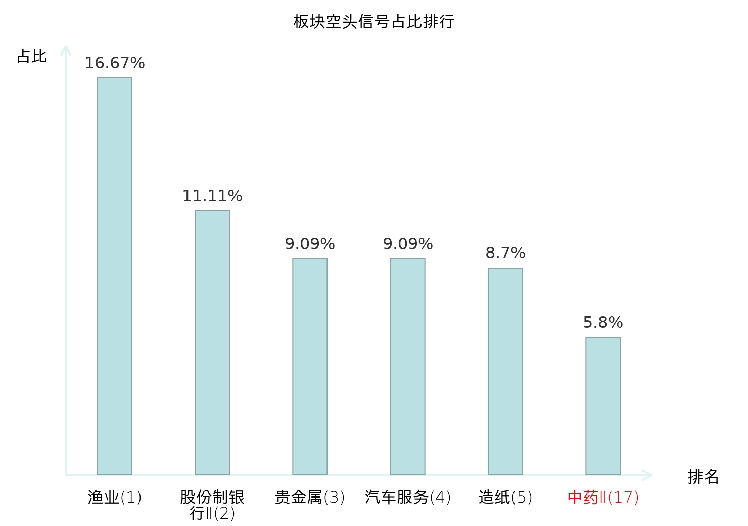 全市场所有行业板块中主力空头信号占比排名中,渔业板块位居第一。电机Ⅱ板块名次提升最快,较昨日上升113位。