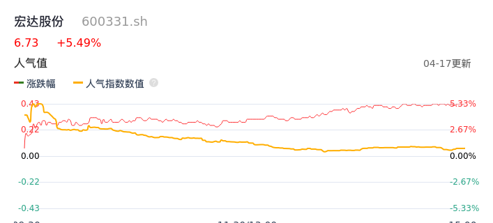 04月17日,宏达股份收报6.73,股价涨幅5.49%,成交金额1.93亿元,换手率1.43%。