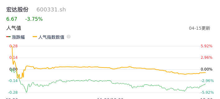 04月15日,宏达股份收报6.67,股价涨幅-3.75%,成交金额2.96亿元,换手率2.18%。