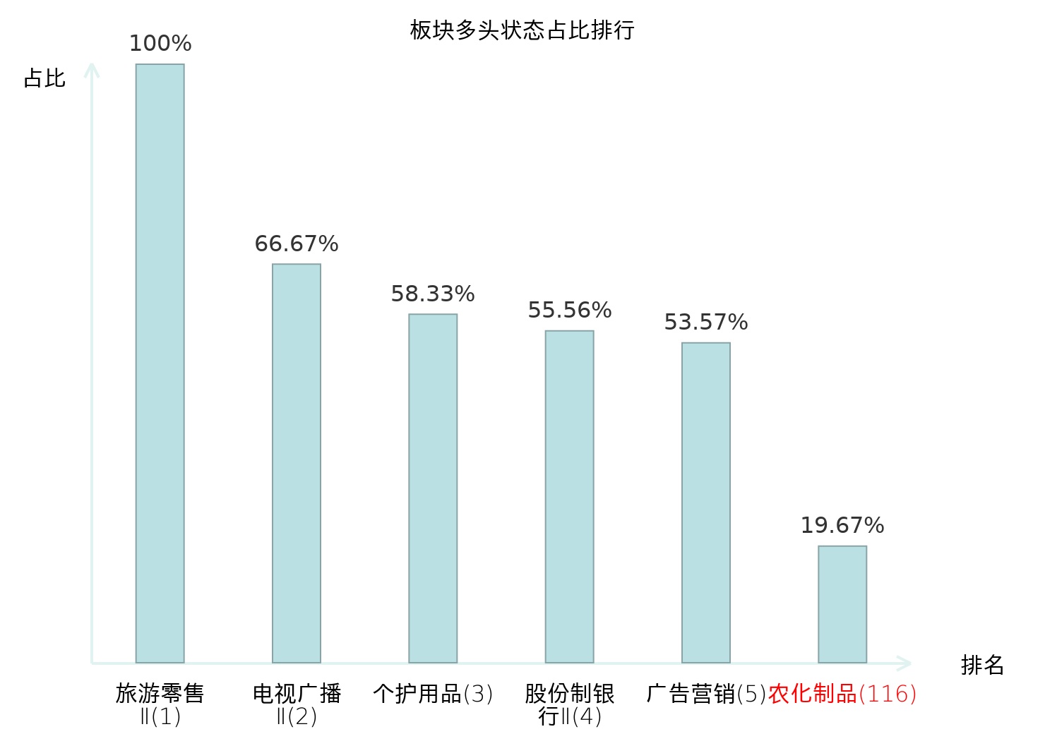 全市场所有行业板块中主力多头状态占比排名中,旅游零售Ⅱ板块位居第一。国有大型银行Ⅱ板块名次提升最快,较昨日上升106位。