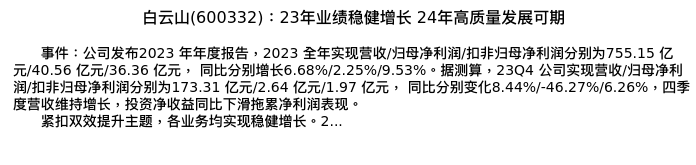 值得注意的是:2024年04月长城证券的刘鹏/罗丽文分析师,首次发布关于白云山的研究报告,标题为:白云山(600332):23年业绩稳健增长 24年高质量发展可期。