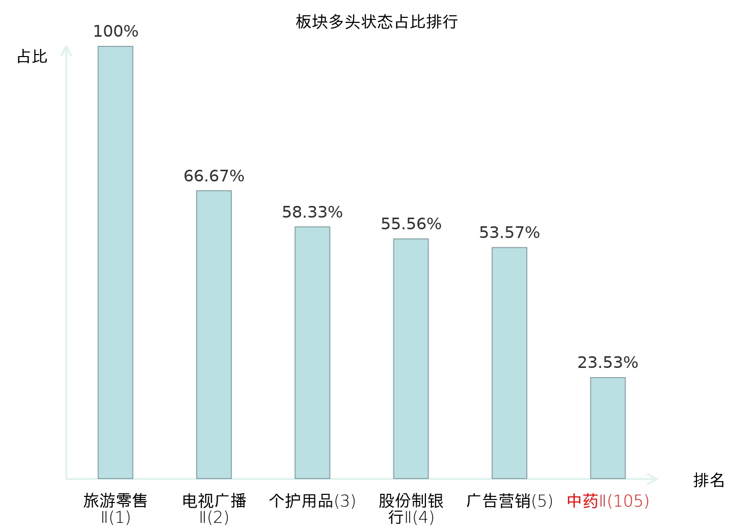 全市场所有行业板块中主力多头状态占比排名中,旅游零售Ⅱ板块位居第一。国有大型银行Ⅱ板块名次提升最快,较昨日上升106位。