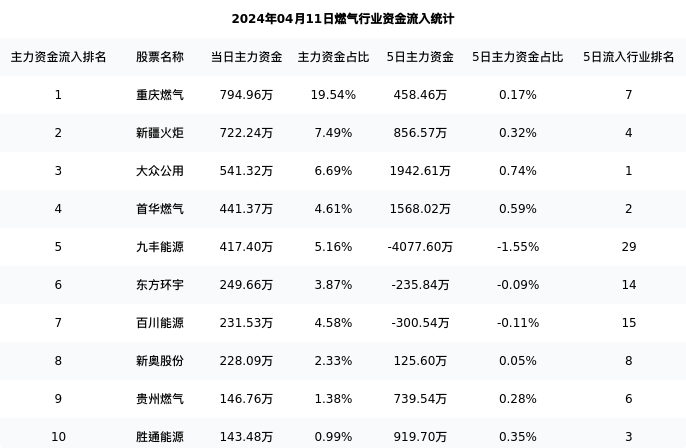 从主力资金流向来看,燃气行业今日主力资金流入3.74亿元,在所有申万二级行业中排名:76/131。