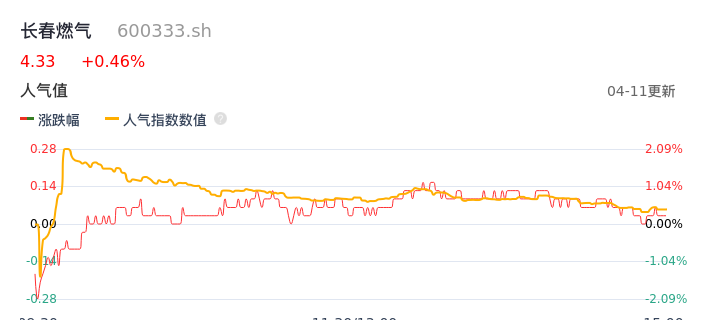 04月11日,长春燃气收报4.33,股价涨幅0.46%,成交金额4535.82万元,换手率1.73%。