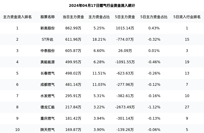 长春燃气今日净流入498.02万元,主力占比11.51%,在行业内排名:5/29;5日净流出623.63万元,主力占比0.26%,在行业内排名:13/29。