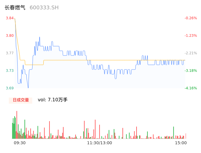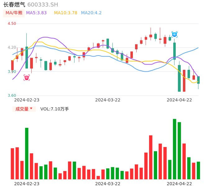 04月22日,长春燃气收报3.75,股价涨幅-2.60%,成交金额2658.75万元,换手率1.17%。