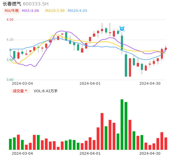 04月30日,长春燃气收报4.08,股价涨幅0.49%,成交金额2612.03万元,换手率1.05%。