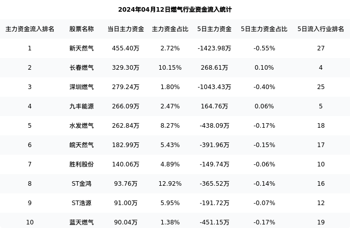 从主力资金流向来看,燃气行业今日主力资金流入3.38亿元,在所有申万二级行业中排名:117/131。