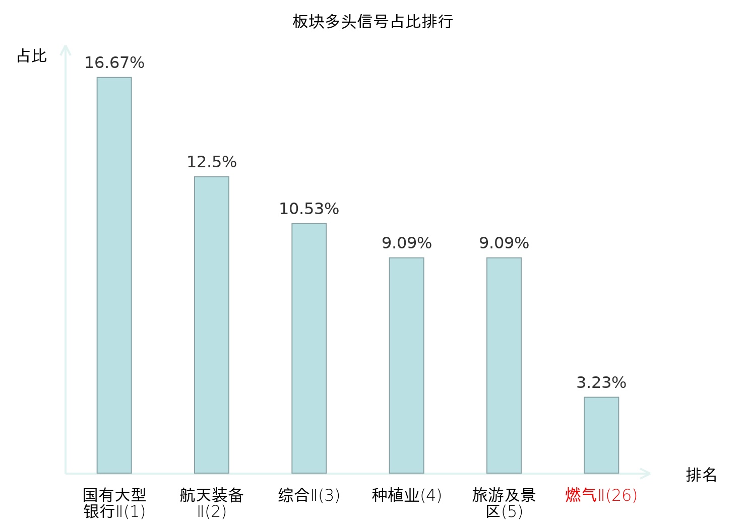 全市场所有行业板块中主力多头信号占比排名中,国有大型银行Ⅱ板块位居第一。国有大型银行Ⅱ板块名次提升最快,较昨日上升123位。