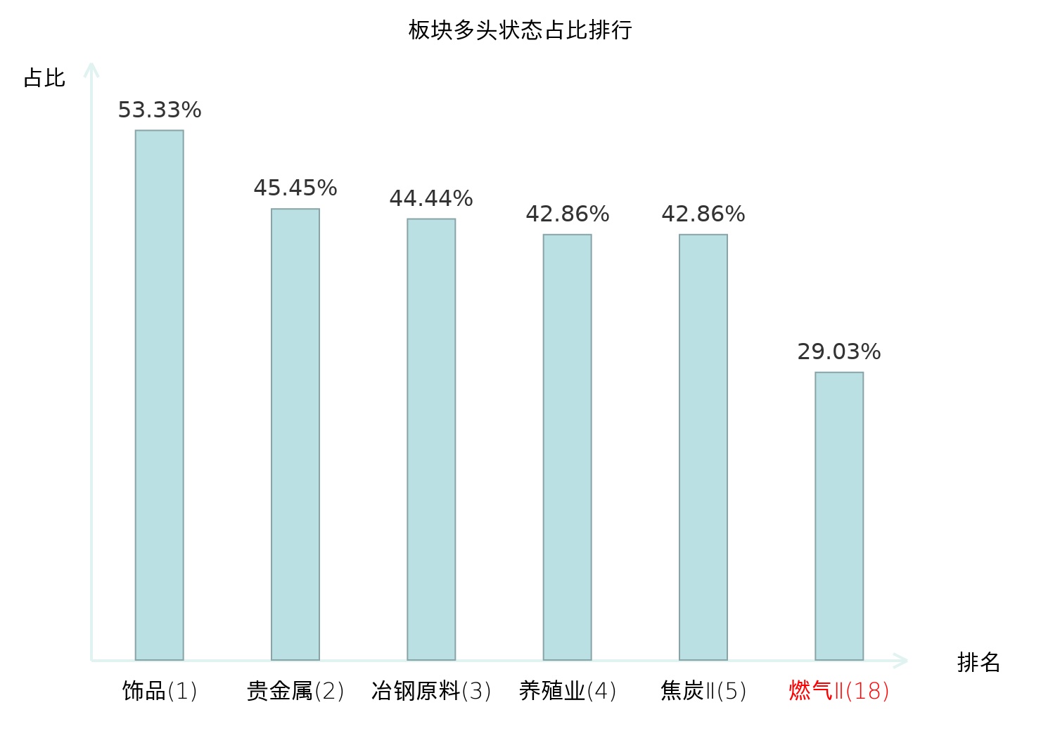 全市场所有行业板块中主力多头状态占比排名中,饰品板块位居第一。非金属材料Ⅱ板块名次提升最快,较昨日上升58位。