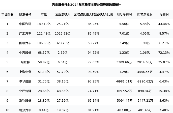 国机汽车最新报告期数据为三季度,下表汇总了汽车服务行业内市值靠前的公司三季度主要经营数据