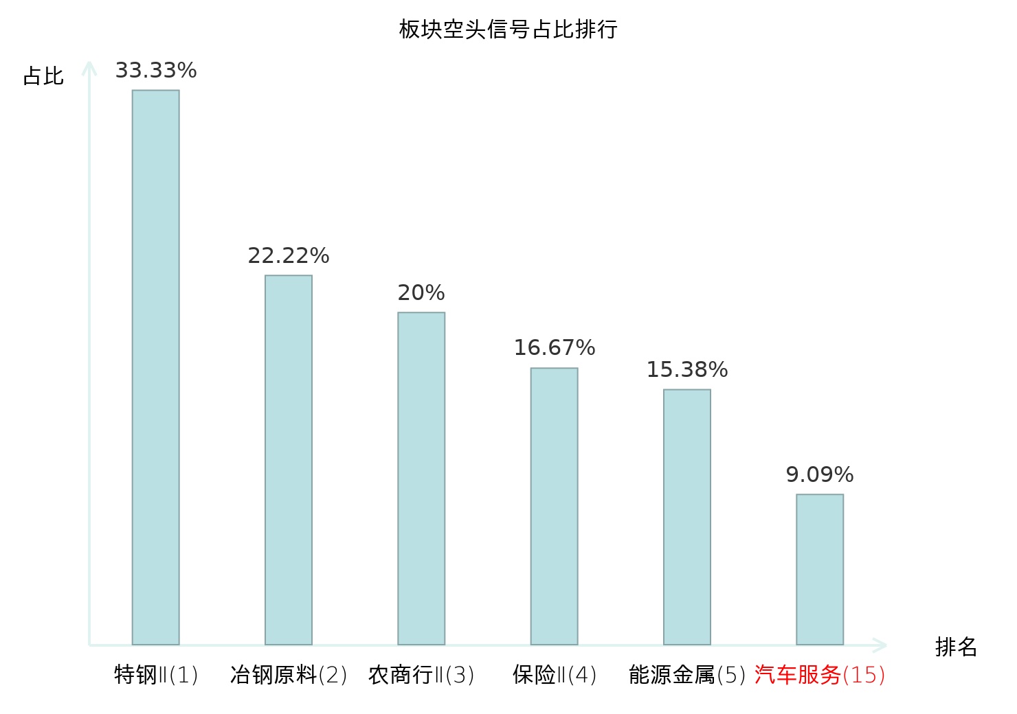 全市场所有行业板块中主力空头信号占比排名中,特钢Ⅱ板块位居第一。其他电子Ⅱ板块名次提升最快,较昨日上升117位。