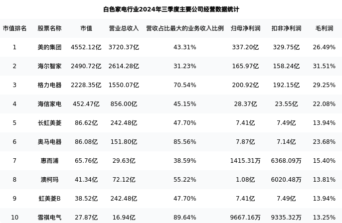 澳柯玛最新报告期数据为三季度,下表汇总了白色家电行业内市值靠前的公司三季度主要经营数据