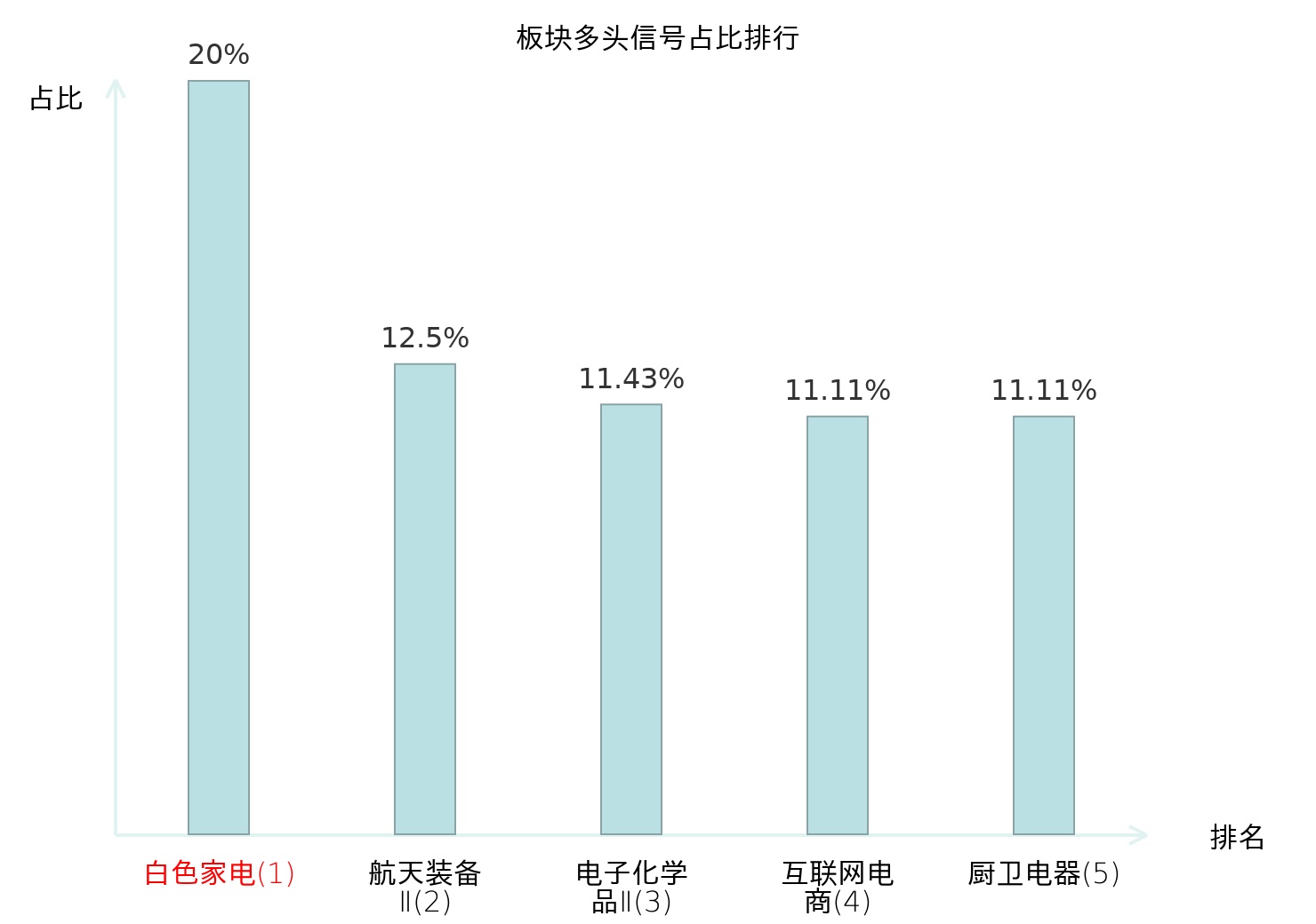 全市场所有行业板块中主力多头信号占比排名中,白色家电板块位居第一。航天装备Ⅱ板块名次提升最快,较昨日上升118位。