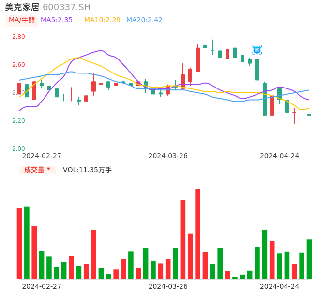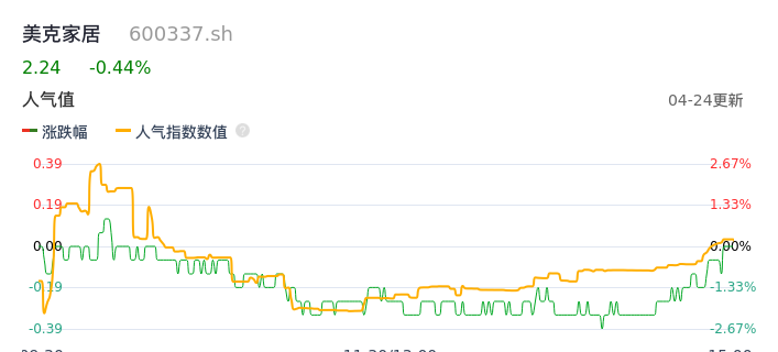 04月24日,美克家居收报2.24,股价涨幅-0.44%,成交金额2520.46万元,换手率0.77%。