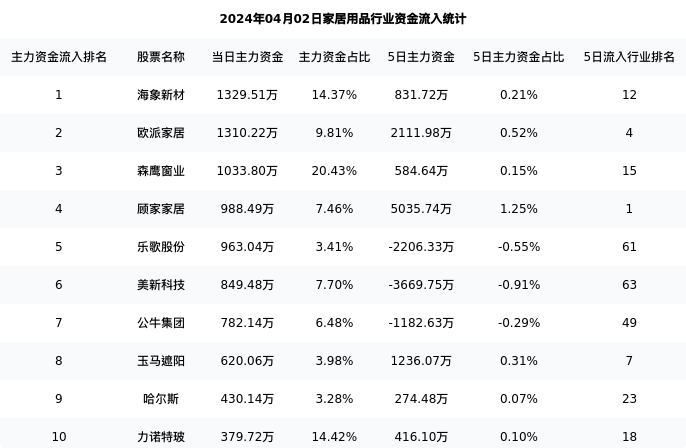 从主力资金流向来看,家居用品行业今日主力资金流入11.21亿元,在所有申万二级行业中排名:77/131。