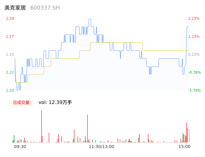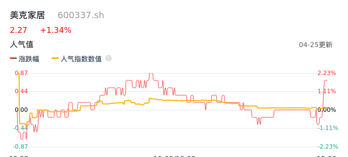 04月25日,美克家居收报2.27,股价涨幅1.34%,成交金额2789.62万元,换手率0.84%。