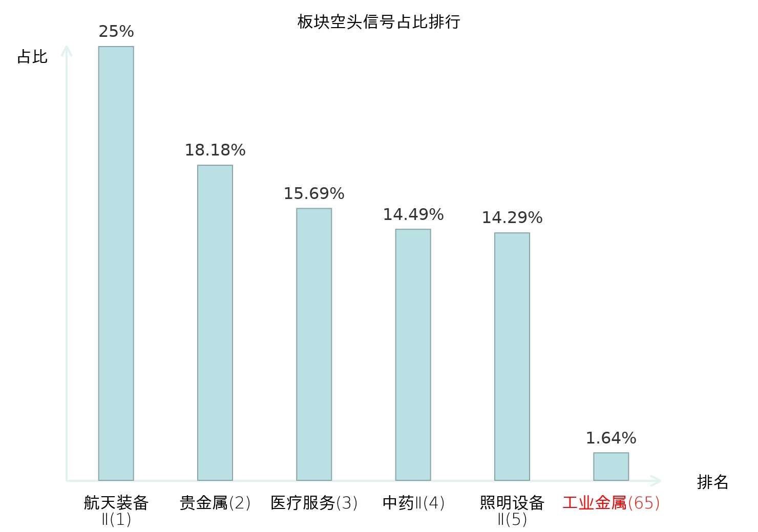 全市场所有行业板块中主力空头信号占比排名中,航天装备Ⅱ板块位居第一。物流板块名次提升最快,较昨日上升112位。