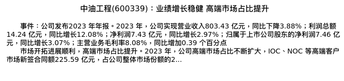 值得注意的是:2024年04月海通证券的朱军军/胡歆/刘威分析师,首次发布关于中油工程的研究报告,标题为:中油工程(600339):业绩增长稳健 高端市场占比提升。