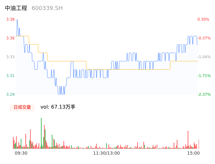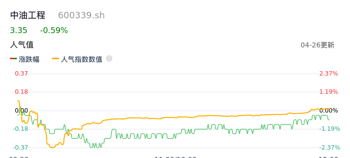 04月26日,中油工程收报3.35,股价涨幅-0.59%,成交金额2.23亿元,换手率1.20%。