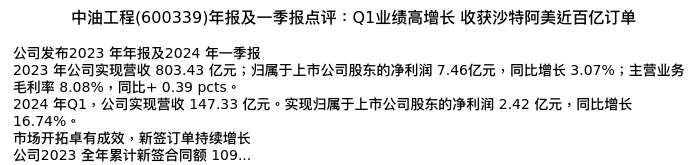 值得注意的是:2024年04月天风证券的张樨樨/鲍荣富分析师,首次发布关于中油工程的研究报告,标题为:中油工程(600339)年报及一季报点评:Q1业绩高增长 收获沙特阿美近百亿订单。