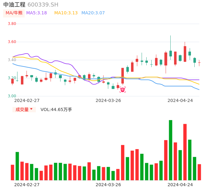 04月24日,中油工程收报3.37,股价涨幅0.00%,成交金额1.50亿元,换手率0.80%。