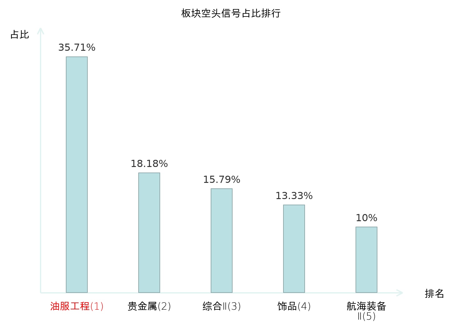 全市场所有行业板块中主力空头信号占比排名中,油服工程板块位居第一。油服工程板块名次提升最快,较昨日上升108位。