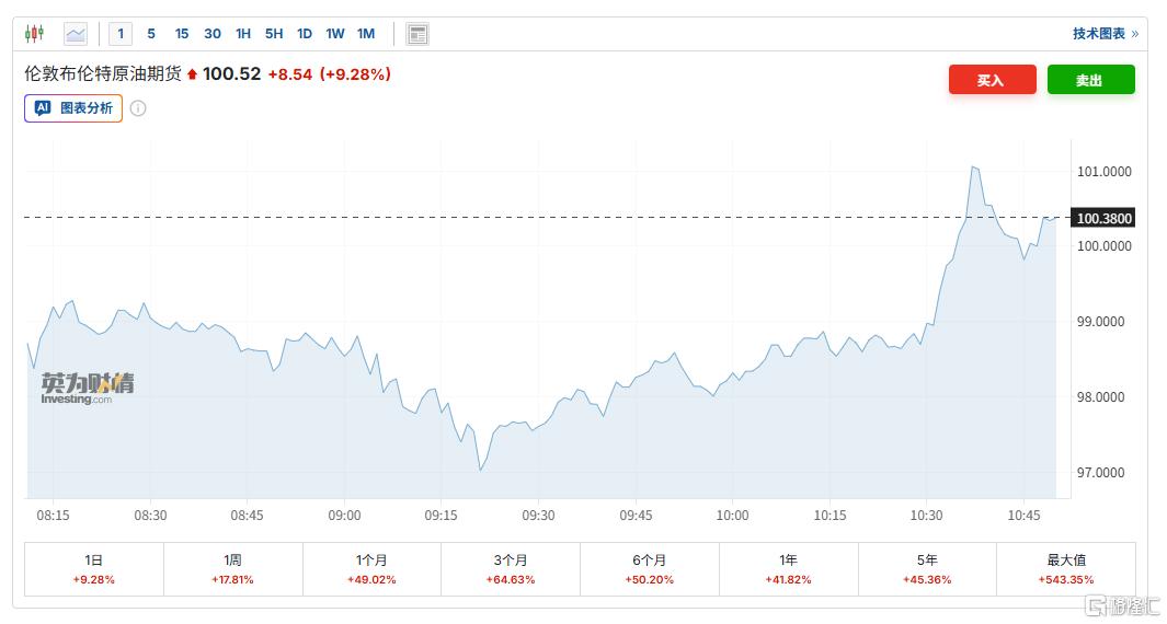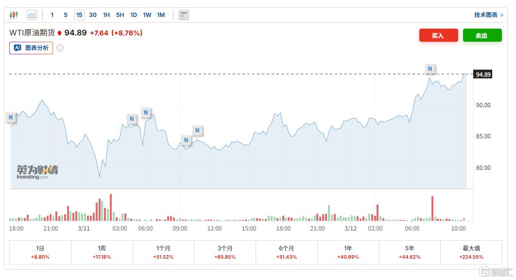 这一消息再度引发了油价的拉升,WTI原油期货突破94美元/桶,现涨8.79%;布伦特原油期货突破100美元/桶,现涨9.28%。