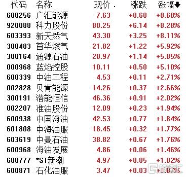 A股市场油服板块同样大幅拉升,广汇能源、科力股份涨超8%,通源石油涨超5%,中油工程、贝肯能源、潜能恒信、中海油服、中曼石油纷纷上涨。