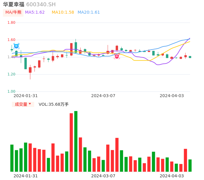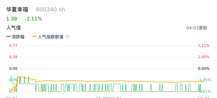 04月03日,华夏幸福收报1.39,股价涨幅-2.11%,成交金额4985.68万元,换手率0.92%。