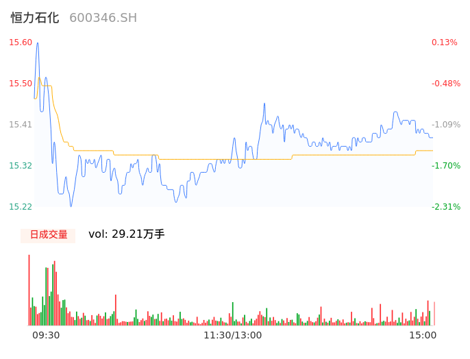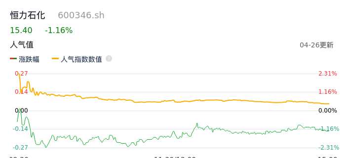 04月26日,恒力石化收报15.40,股价涨幅-1.16%,成交金额4.48亿元,换手率0.41%。