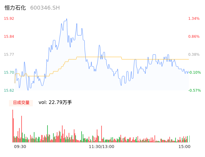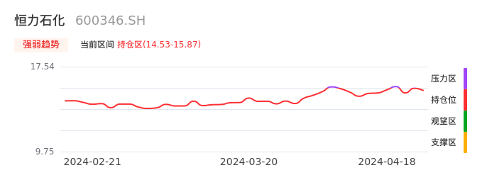 04月18日,恒力石化收报15.69,股价涨幅-0.13%,成交金额3.59亿元,换手率0.32%。