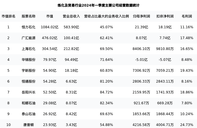 恒力石化最新报告期数据为一季度,下表汇总了炼化及贸易行业内市值靠前的公司一季度主要经营数据