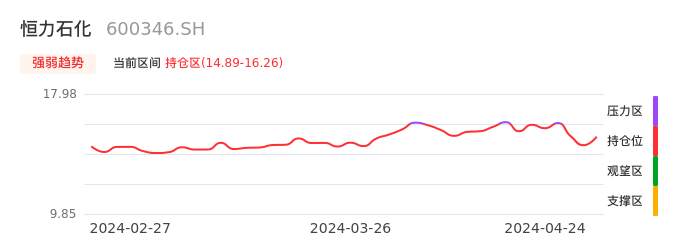 我们来看一下该股的九方特色指标强弱趋势的情况:恒力石化近日从压力区回到持仓区。股价快速拉升后出现持续调整,目前出现启稳回暖态势。后续重点关注上方压力位:16.26元是否能再次上攻。