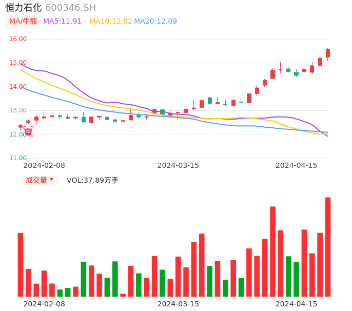 04月15日,恒力石化收报15.58,股价涨幅2.50%,成交金额5.84亿元,换手率0.54%。