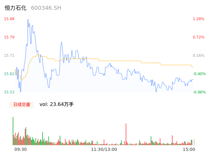 04月25日,恒力石化收报15.58,股价涨幅-0.64%,成交金额3.70亿元,换手率0.34%。