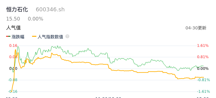 04月30日,恒力石化收报15.50,股价涨幅0.00%,成交金额3.43亿元,换手率0.31%。