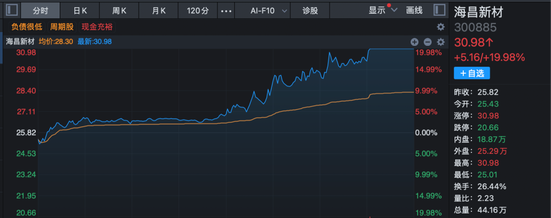 市场热点方面,机器人产业链午后集体放量拉升,人形机器人方向最为活跃,板块指数午后一开盘就急速上扬,创2个半月新高,并逼近历史最高点。步科股份下午开盘仅约2分钟直线20%涨停,连续第2日封板,股价创历史新高;海昌新材则在临近收盘20cm涨停,万向钱潮、浙江荣泰、三花智控等近20股也强势涨停或涨超10%。