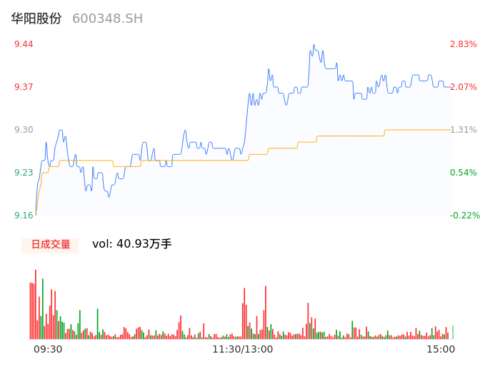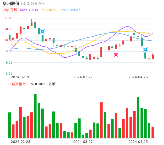 04月25日,华阳股份收报9.36,股价涨幅1.96%,成交金额3.81亿元,换手率1.13%。