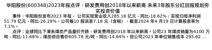 值得注意的是:2024年04月光大证券的王招华/马俊分析师,首次发布关于华阳股份的研究报告,标题为:华阳股份(600348)2023年报点评:研发费用创2018年以来新高 未来3年股东分红回报规划夯实投资价值。