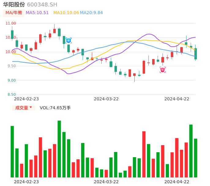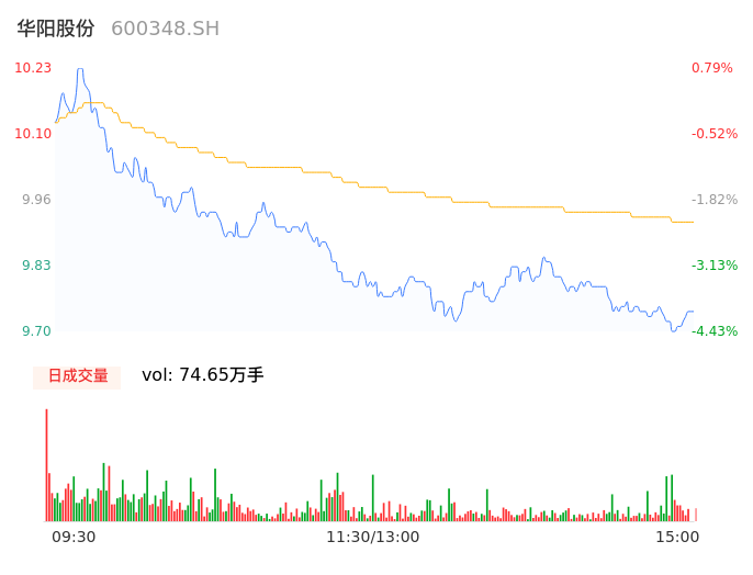04月22日,华阳股份收报9.74,股价涨幅-4.04%,成交金额7.40亿元,换手率2.07%。