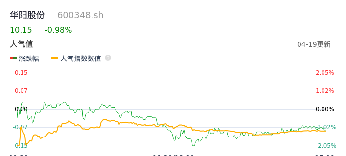 04月19日,华阳股份收报10.15,股价涨幅-0.98%,成交金额9.63亿元,换手率2.62%。