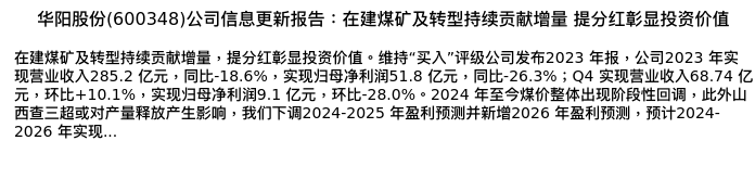 值得注意的是:2024年04月开源证券的分析师,首次发布关于华阳股份的研究报告,标题为:华阳股份(600348)公司信息更新报告:在建煤矿及转型持续贡献增量 提分红彰显投资价值。