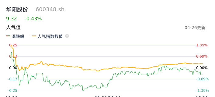 04月26日,华阳股份收报9.32,股价涨幅-0.43%,成交金额3.74亿元,换手率1.11%。