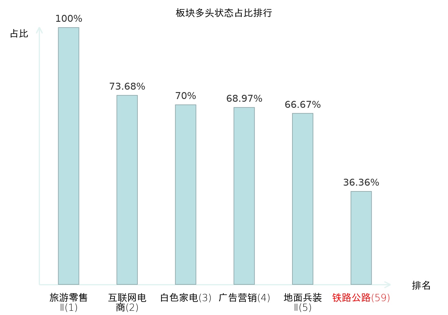 全市场所有行业板块中主力多头状态占比排名中,旅游零售Ⅱ板块位居第一。厨卫电器板块名次提升最快,较昨日上升76位。
